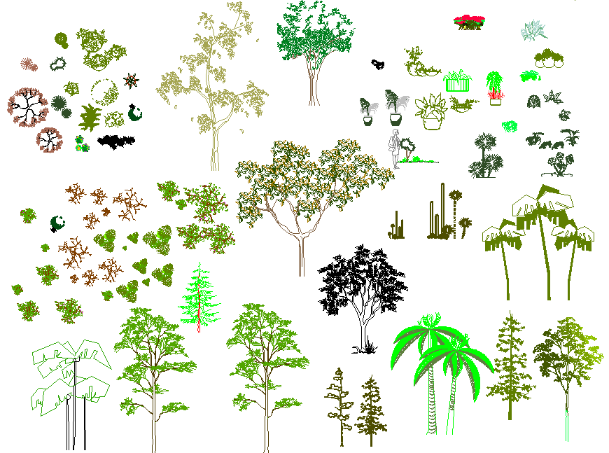 This Tree CAD block drawing provides a comprehensive AutoCAD DWG layout featuring 2D front views of various tree and plant types. The file includes multiple species of trees, shrubs, and potted plants designed for landscape, architectural, and urban planning projects. Each block is accurately scaled and well-detailed, representing natural shapes and textures suitable for professional design presentations. The layout features tropical palms, ornamental trees, garden plants, and elevation views that enhance the visual composition of architectural drawings.