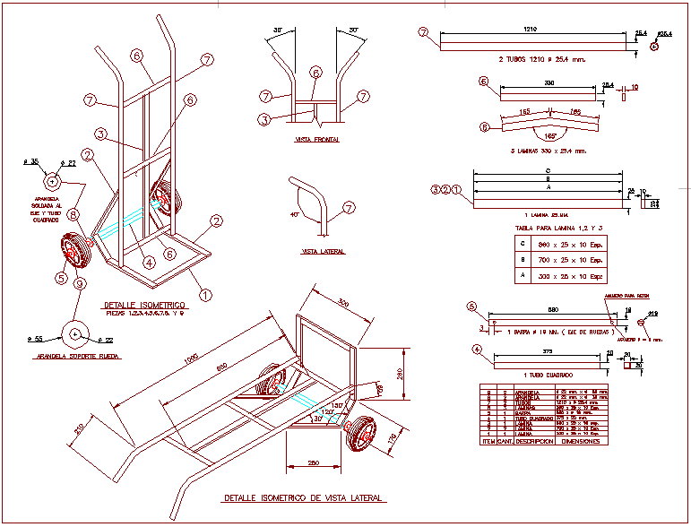 barrow and detail view of wheel,bar,sheet,tube and washer view with necessary dimension and detail.