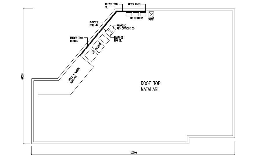 This architectural drawing is Detail floor plan of RBS structure in AutoCAD, dwg file, CAD file. In this drawing there were office, canteen, feeder tray, access cable, shaft, proposed pole, roof top, etc. are given with details. For more details and information download the drawing file.