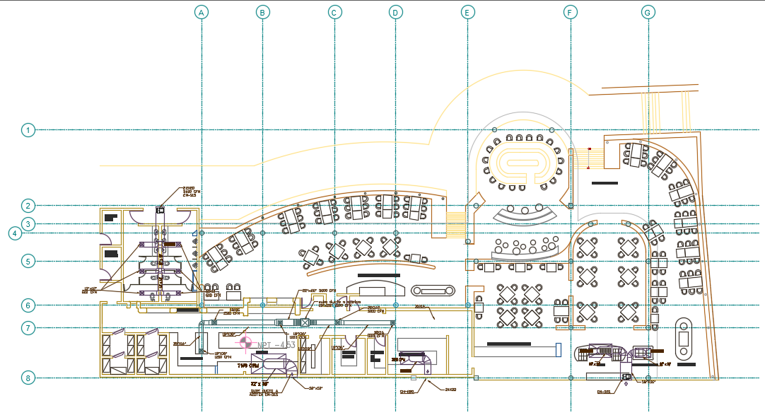 Restaurant plan dwg file. Find here layout plan along of furniture detailing in autocad format.