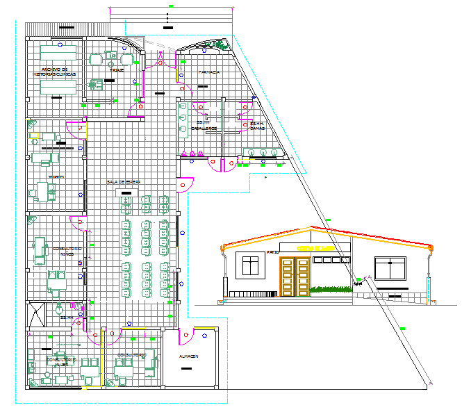 Health Center, architecture layout , floor plan, furniture layout, exterior elevation