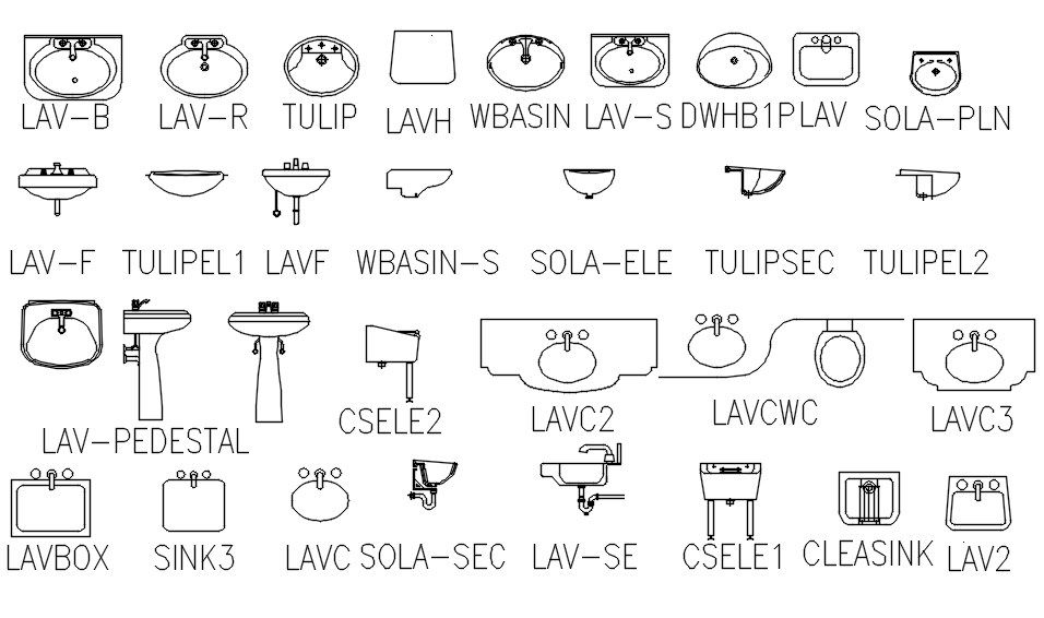 2D blocks of different types of washbasins in AutoCAD drawing, dwg file, CAD file