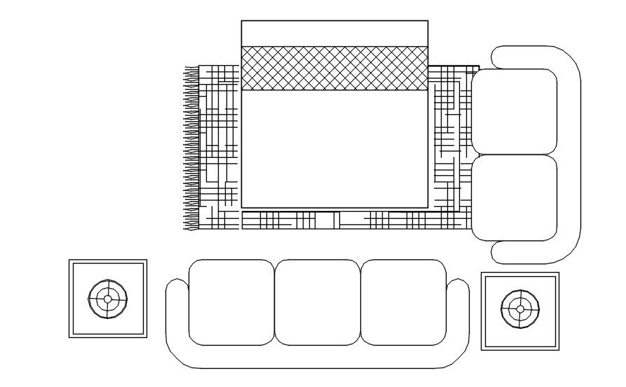 This Architectural Drawing is AutoCAD 2d drawing of Drawing room sofa set layout in AutoCAD, dwg file. A typical Western living room may contain furnishings such as a sofa, chairs, occasional tables, coffee tables, bookshelves, televisions, electric lamps, rugs, or other furniture.