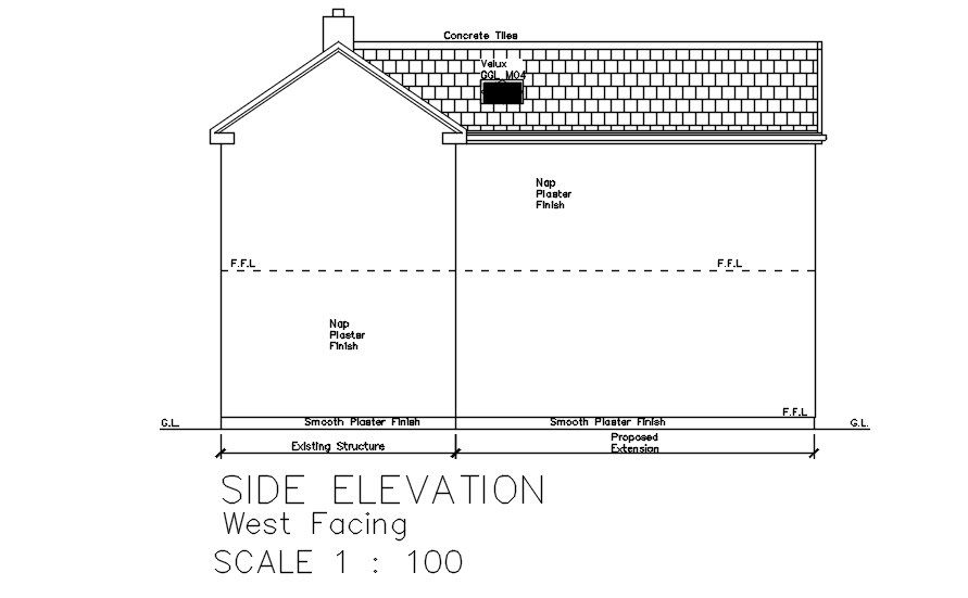 This Archiotectural Drawing is AutoCAD 2d drawing of Side elevation west facing house in AutoCAD, dwg file. However, according to Vastu Shastra, all homes are considered equally auspicious, and there is no such thing that west-facing homes are not as good as north or east-facing homes. A west-facing home can be as equally prosperous as other homes, provided you follow certain Vastu Shastra principles.