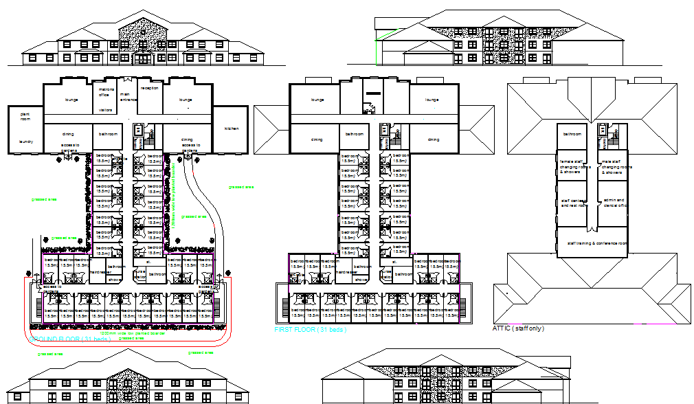 This hotel project cad drawing file provides complete architectural design information useful for planning and development stages. The file includes all floor plans with clear spatial arrangements, circulation paths, and room distribution layouts for guest rooms, common activity spaces, lobby areas, and service sections. Elevations are provided to understand the external building appearance and facade detailing. Each drawing is organized to support accurate drafting and design referencing, making it suitable for architects, interior designers, and civil engineers involved in hospitality projects. The drawing is structured in a format that is easy to edit and adapt in AutoCAD or similar cad software.