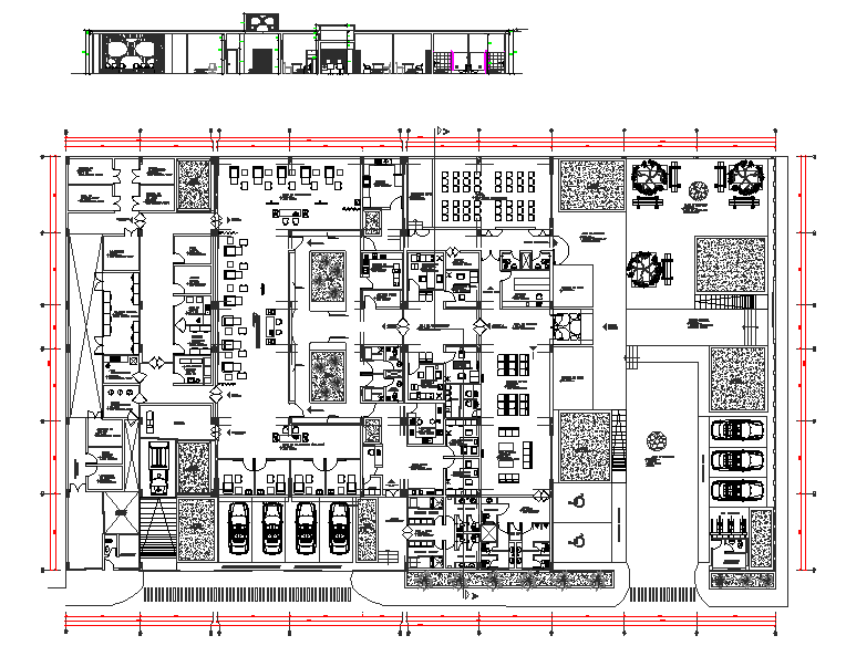Architectural layout plan with detailing, sectional plan, sectional elevation