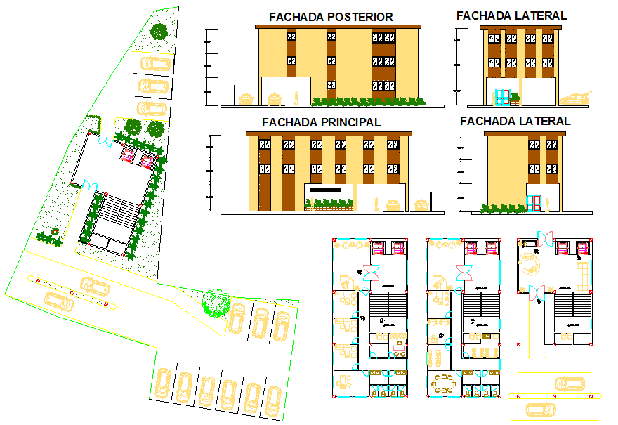office building architecture layout plan with detailing, structure plan, sectional elevation of individual floor, exterior elevation