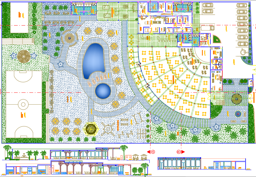 Restaurant Campestre dwg file with garden,kitchen,dining area,football,basket ball ground,swimming pull,parking and seating area.and way of walking
