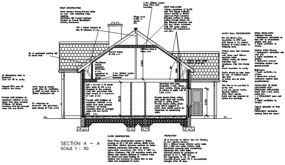 Section A-A of house with their structural details in AutoCAD 2D drawing, dwg file, CAD file