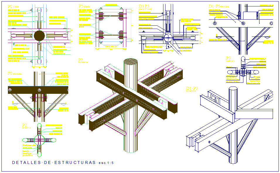 Structure detail view of wooden column and beam dwg file with view of round and