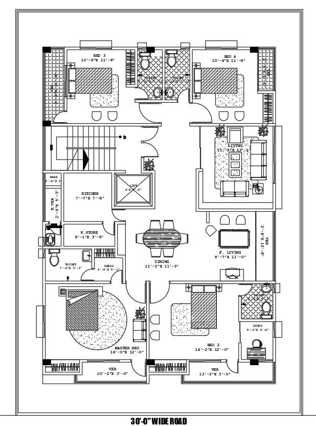 2D floor plan of 4bhk house in AutoCAD drawing, dwg file, CAD file