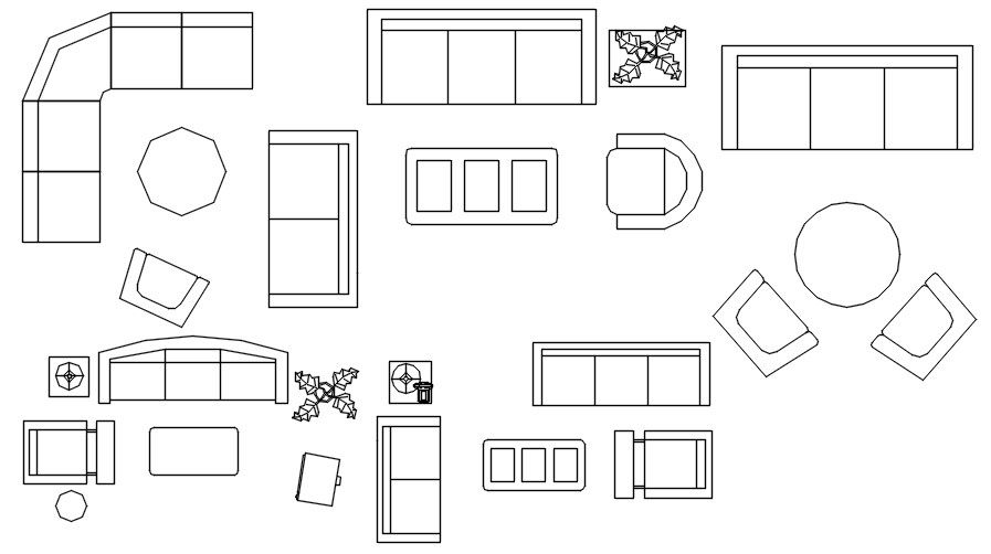 This Architectural Drawing is AutoCAD 2d drawing of AutoCAD, dwg file of 2d cad blocks of Sofa set layout. Sofa sets, the soul of a living room, should be east (or south) facing as the maximum sunlight we receive in our home is from east. The south-east direction is the best for placing your TV unit/cabinet.