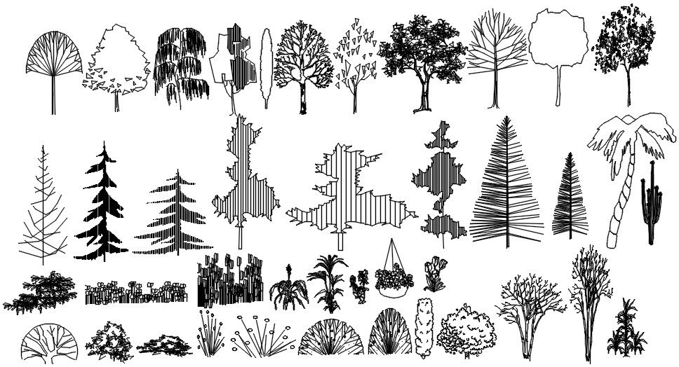 Side elevation of plants and trees in AutoCAD 2D drawing, CAD file, dwg file