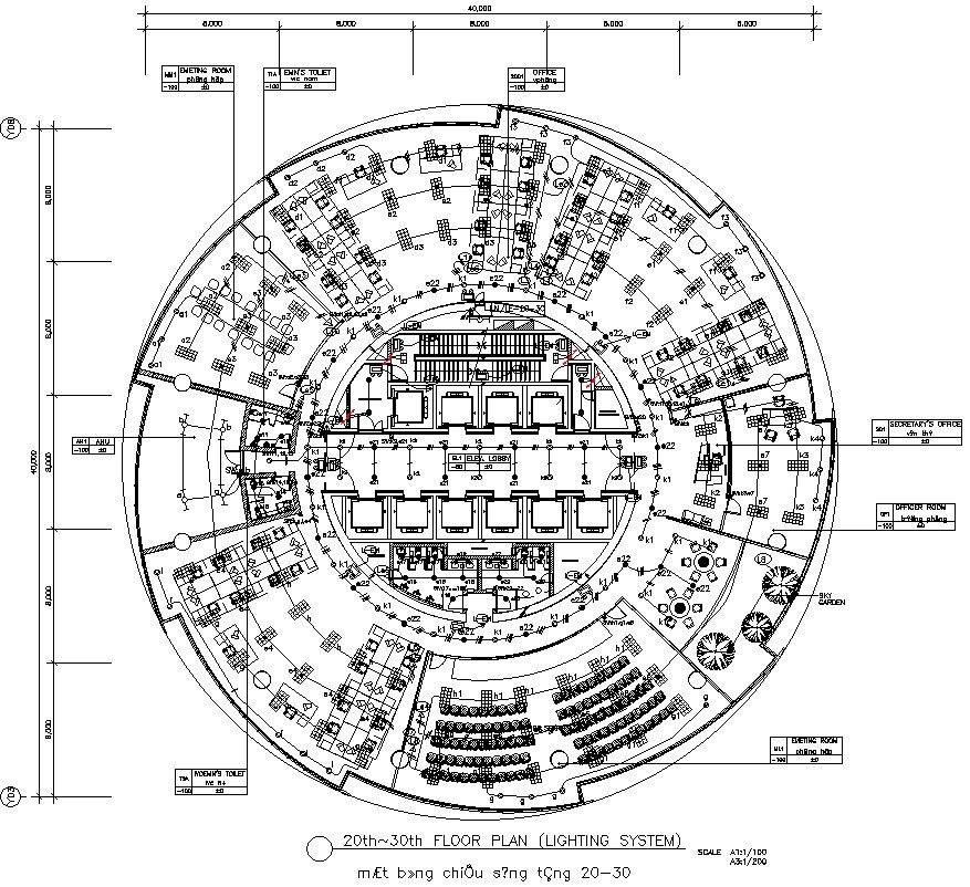 This architectural drawing is the 20th-30th floor plan of the lighting system in AutoCAD 2D drawing, dwg file, and CAD file. A lighting system refers to the plants, works, instruments, and properties employed or helpful in connection with supplying lighting as well as the essential resources and appurtenances for the system. For more information and details download the drawing file. Thank you for visiting our website cadbull.com.