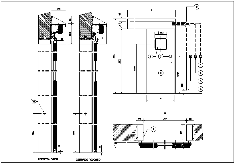 Surgery room automatic door design view dwg file with view of door with dimensional detail and with view of wheel,clamp and sectional detail of door.