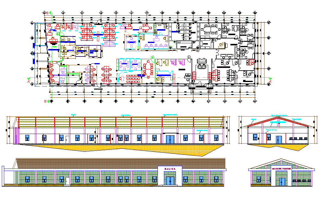 Administrative Office's architecture layout with details, sectional plan, furniture layout, constructional plan, sectional elevation, exterior elevation