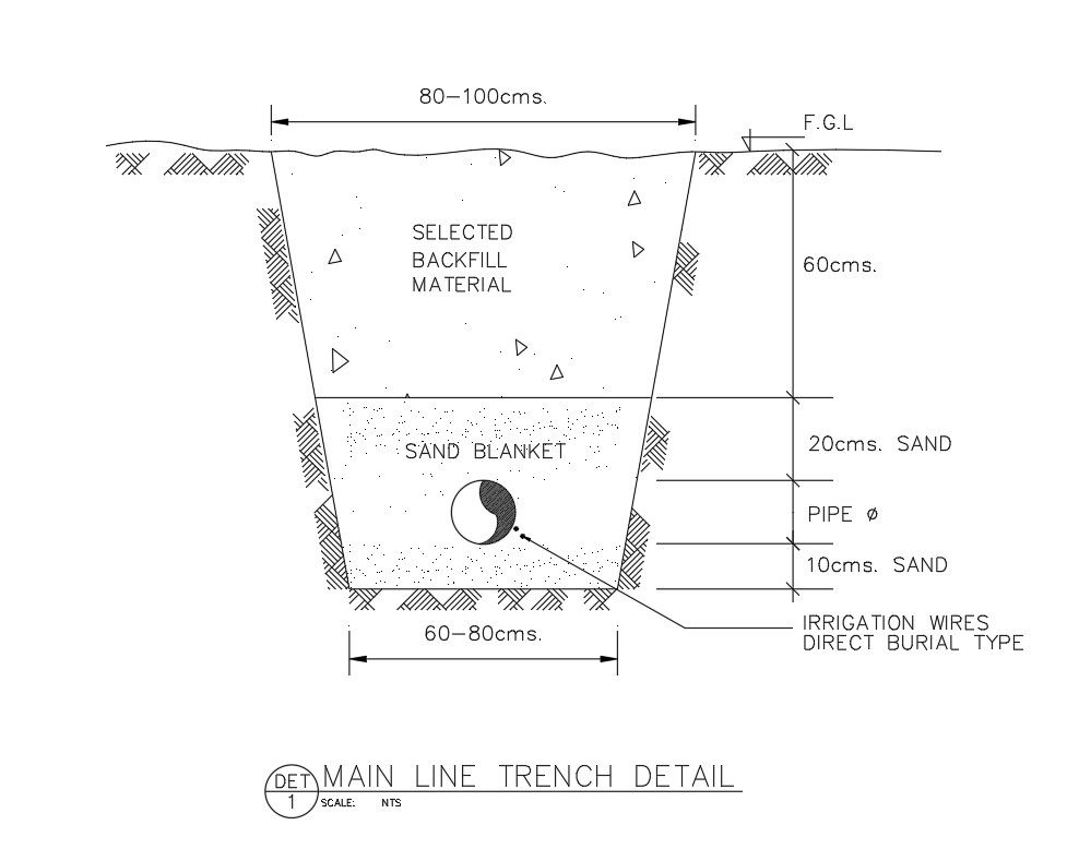 This architectural drawing is Mainline trench detail in AutoCAD 2D drawing, dwg file, CAD file. The irrigation system's main line is the pipe that carries water from the backflow preventer to the remote control valves. This is typically the largest pipe in the irrigation system, and it is upstream from the remote control valves. It is typically under constant pressure. For more details and information download the drawing file. Thank you for visiting our website cadbull.com.