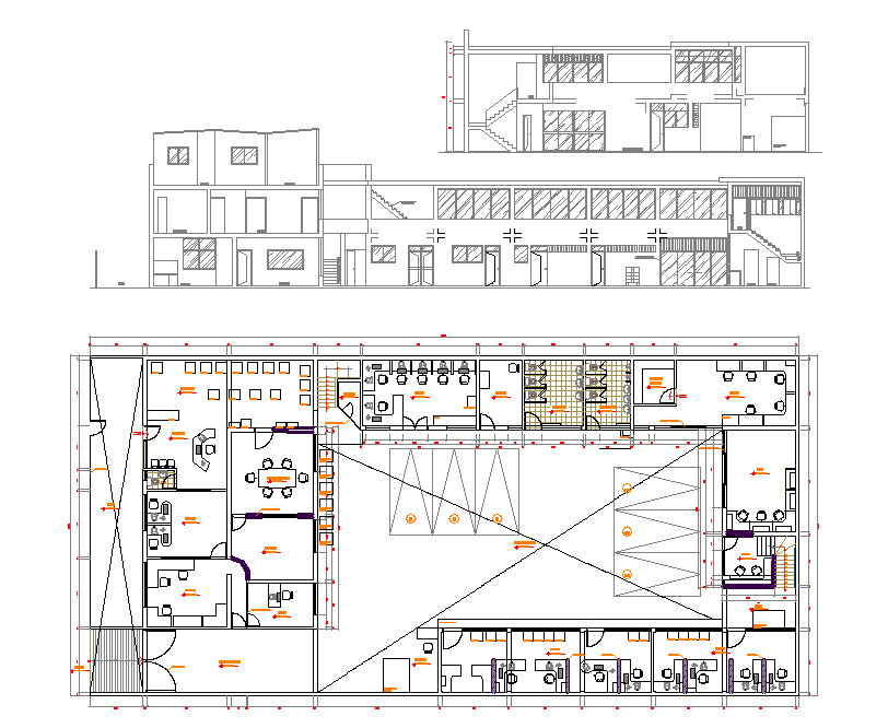 Office Building's architecture layout with detailing, furniture layout, constructional plan, sectional elevation of individual floor