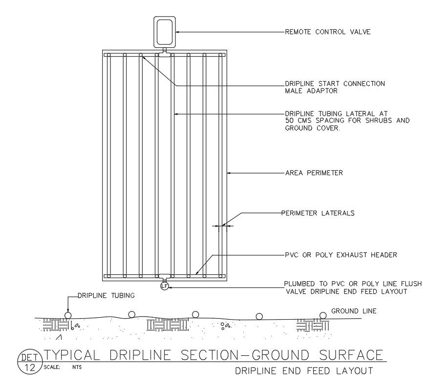 This architectural drawing is a Typical dripline section-ground surface in detail AutoCAD drawing, dwg file, CAD file. Water is transported to your plants by a flexible drip tubing called dripline from the valve. The dripline, which is also referred to as a distribution line, is connected to the pressure regulator via a tubing adapter. Common drip lines are black or brown because they blend in with the mulch and soil. For more details and information download the drawing file. Thank you for visiting our website cadbull.com.
