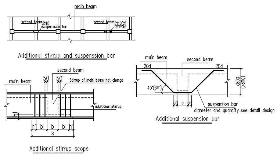 This architectural drawing is Additional stirrups and suspension bar design in AutoCAD 2D drawing, dwg file, and CAD file. For more details and information download the drawing file. Thank you for visiting our website cadbull.com.