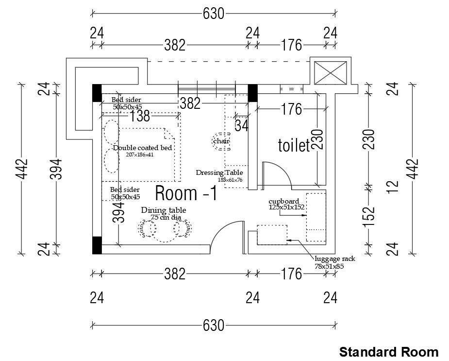 This architectural drawing is a Standard room of resort design in AutoCAD 2D drawing, dwg file, and CAD file. For more details and information download the drawing file. Thank you for visiting our website cadbull.com.