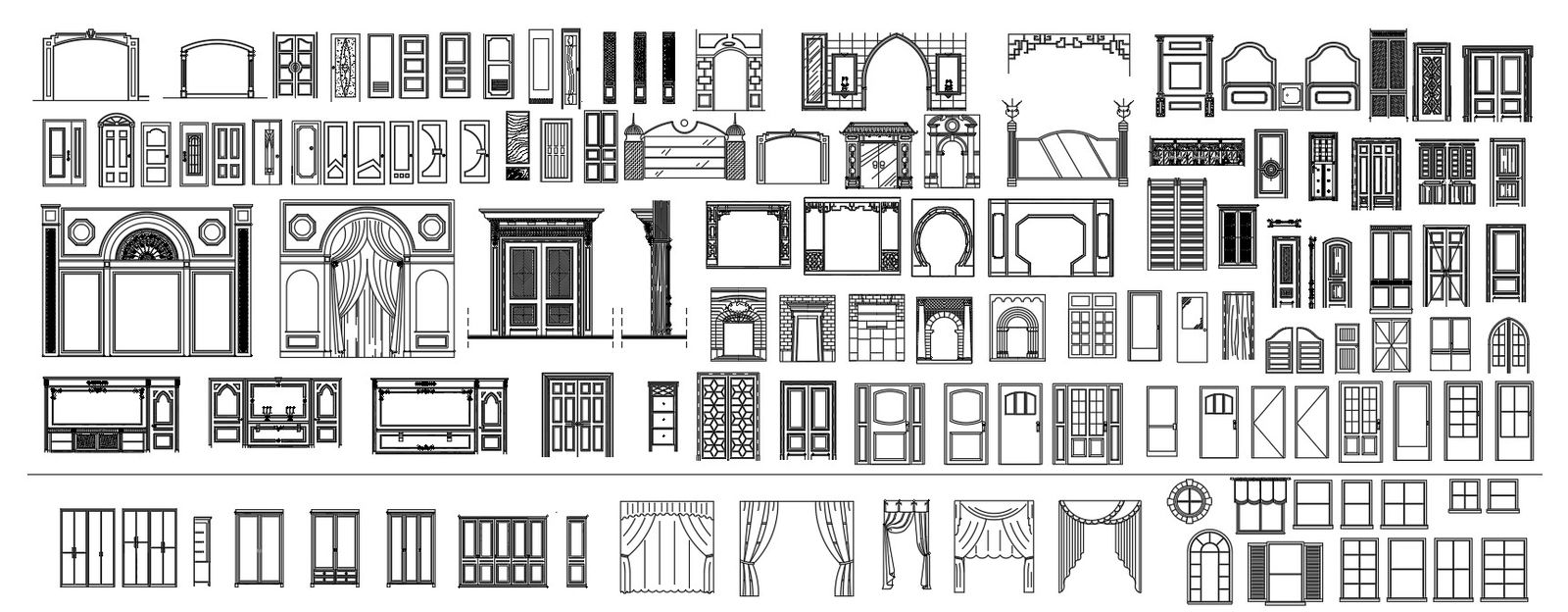 Door, window and curtains CAD blocks in AutoCAD 2D drawing, dwg file, CAD file, dwg file
