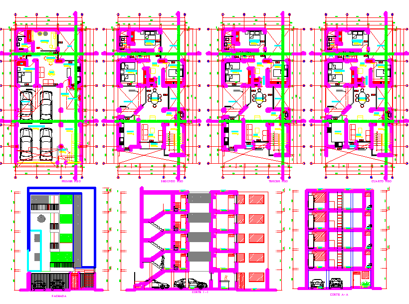 The architecture layout plan, structure plan, construction plan, furniure detailing, section plan and elevation design of Multi Family Residence project.