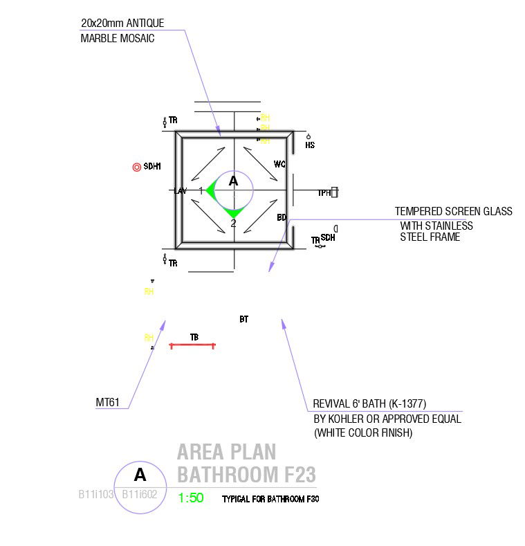 This architectural drawing is an Area plan of the bathroom in detail AutoCAD 2D drawing, dwg file, CAD file. For more details and information download the drawing file. Thank you for visiting our website cadbull.com.