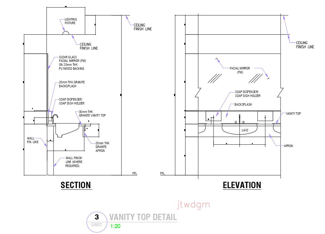 This architectural drawing is a Section and elevation of vanity top detail in AutoCAD 2D drawing, dwg file, and CAD file. For more details and information download the drawing file. Thank you for visiting our website Cadbull.com.
