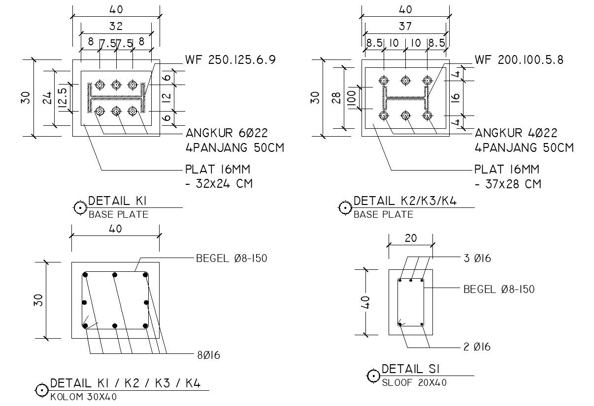 2D design of base plate, column and sloof in detail AutoCAD 2D drawing, CAD file, dwg file