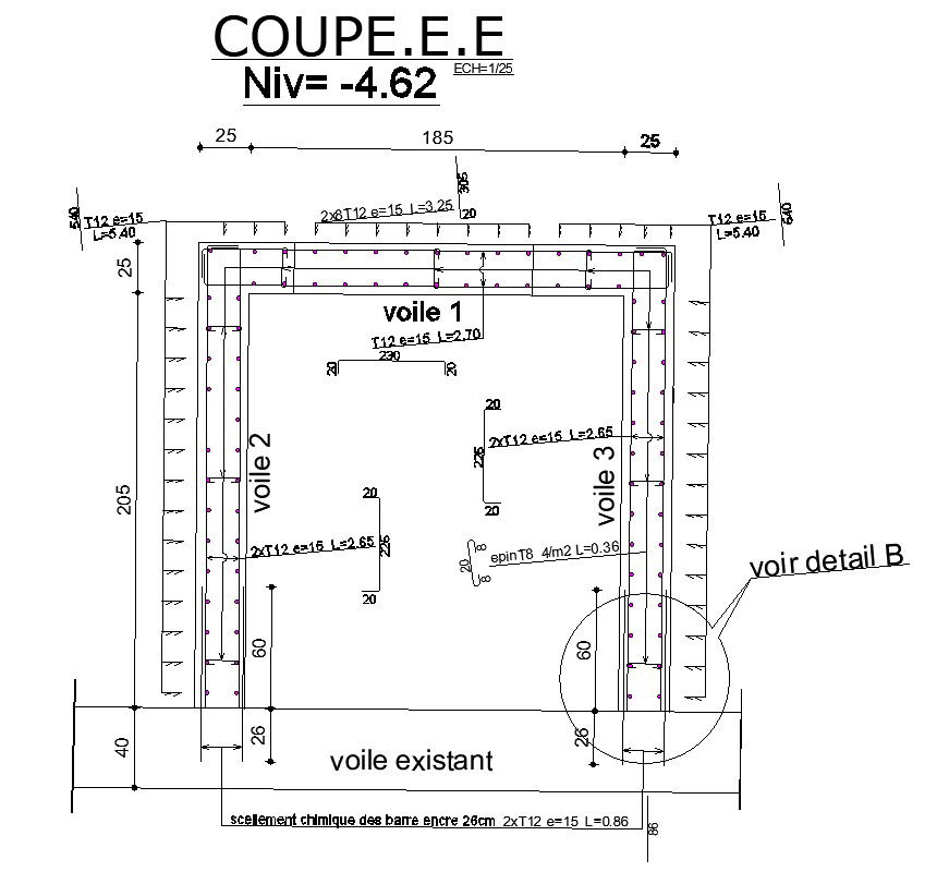 Cross section E of structure with reinforcement details in AutoCAD 2D drawing, CAD file, dwg file