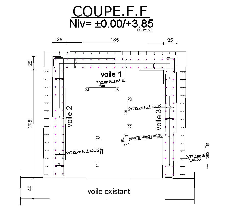 Cross section F of structure with reinforcement details in AutoCAD 2D drawing, CAD file, dwg file