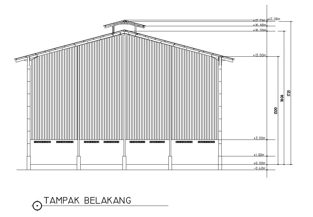 Rear side elevation of factory with dimension and details in AutoCAD 2D drawing, CAD file, dwg file