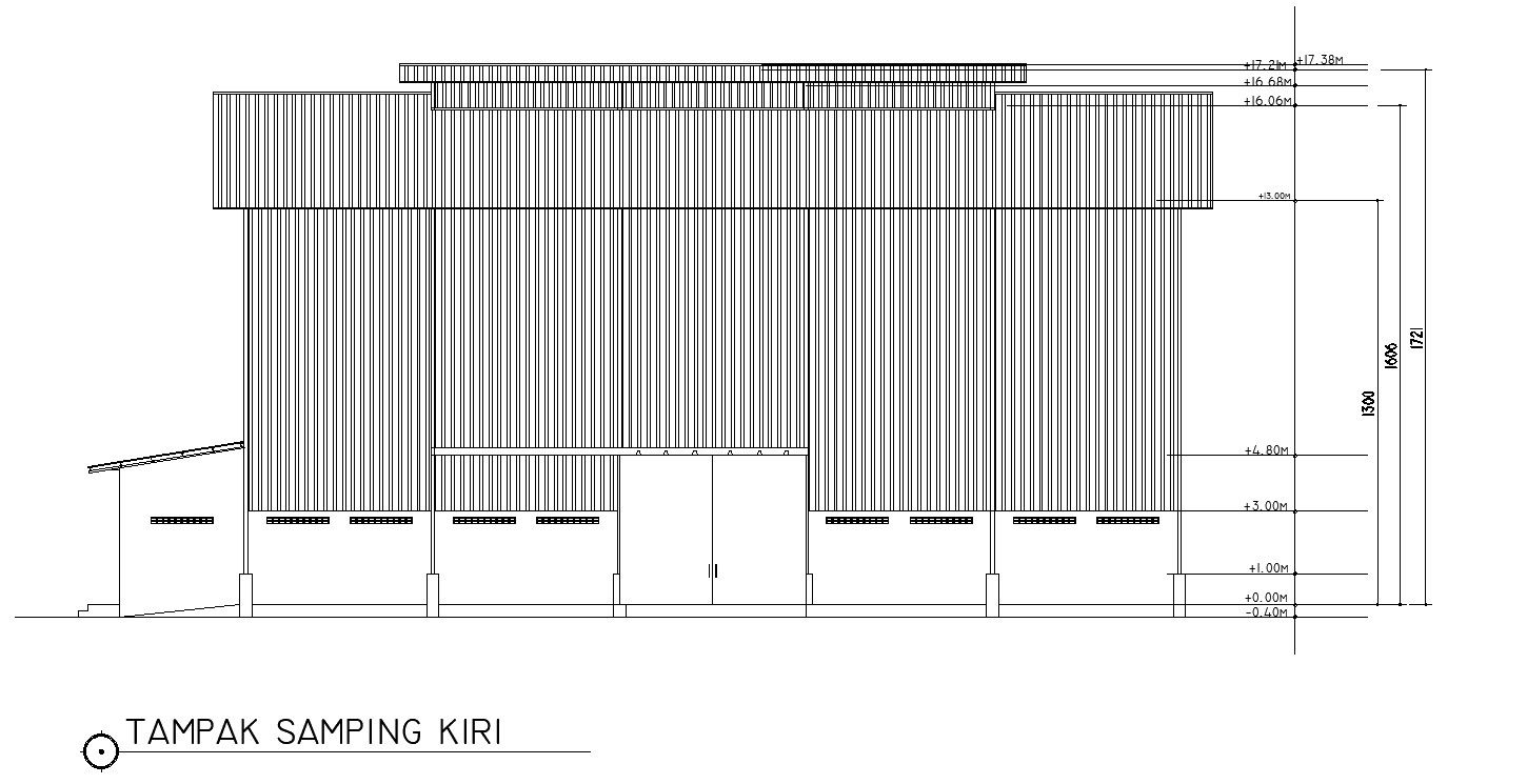2D design of left side elevation of factory with dimensions and details in AutoCAD drawing, CAD file, dwg file