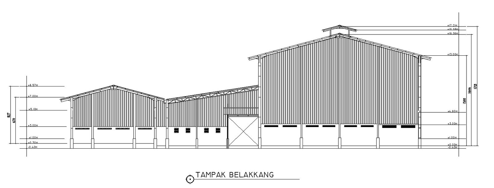 2D design of back side elevation of the factory with dimensions and details in AutoCAD drawing, CAD file, dwg file
