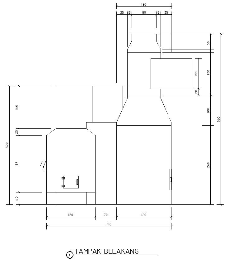 Back view of incinerator plant with dimensions and details in AutoCAD 2D drawing, CAD file, dwg file