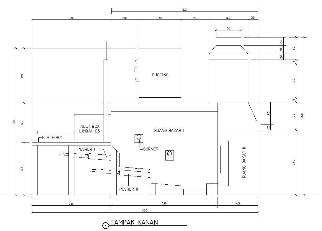Right side view of the incinerator structure in detail AutoCAD 2D drawing, CAD file, dwg file