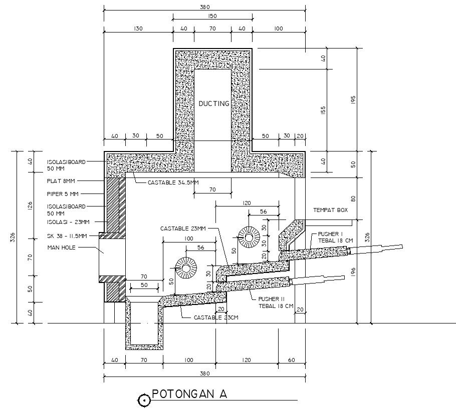Cross section A of the incinerator structure in detail AutoCAD 2D drawing, CAD file, dwg file