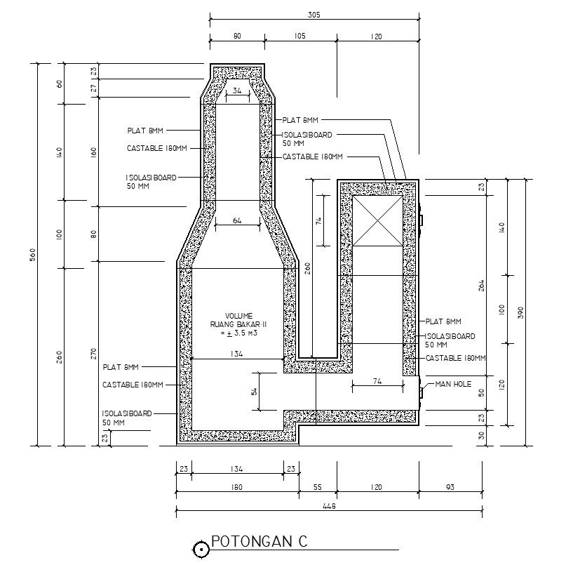 Cross section C of the incinerator structure in detail AutoCAD 2D drawing, CAD file, dwg file