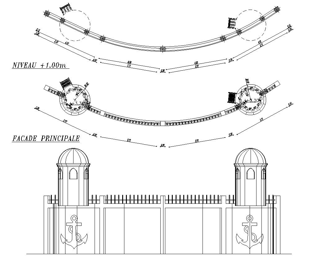 Section and elevation plan of boundary wall with gatehouse detail in AutoCAD 2D drawing, CAD file, dwg file
