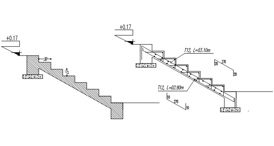 This architectural drawing is the 2D design of a cross-section of stairs with reinforcement details in AutoCAD drawing, CAD file, and dwg file. One-way stairway behavior and slab-connected staircase reinforcement. Negative bending moments are formed at the supports as a result of the staircase's continuation to slabs at its base and top, necessitating the use of rebars at both ends of the upper fibers. For more details and information download the drawing file. Thank you for visiting our website cadbull.com.