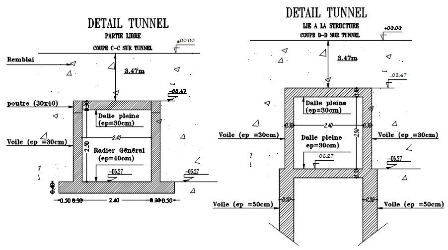 Cross section C and D of tunnel with details in AutoCAD 2D drawing, CAD file, dwg file