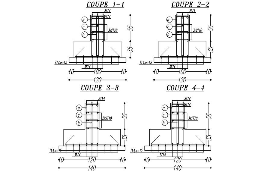 Cross sections of footing with reinforcement details in AutoCAD 2D drawing, CAD file, dwg file