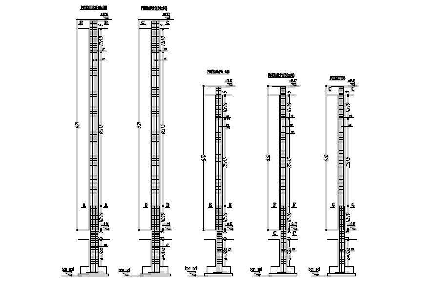 Different heights of column with reinforcement details in AutoCAD 2D drawing, CAD file, dwg file