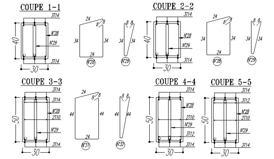 Design of different cross sections of beam reinforcement details in AutoCAD 2D drawing, CAD file, dwg file