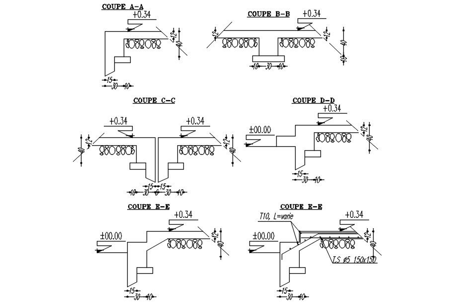 2D design of cross section of staircase with formwork and reinforcement details in AutoCAD drawing, CAD file, dwg file