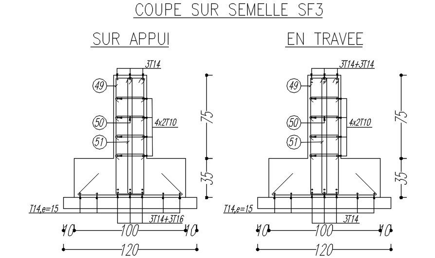 Cross section of sole plate in foundation with reinforcement details in AutoCAD 2D drawing, CAD file, dwg file