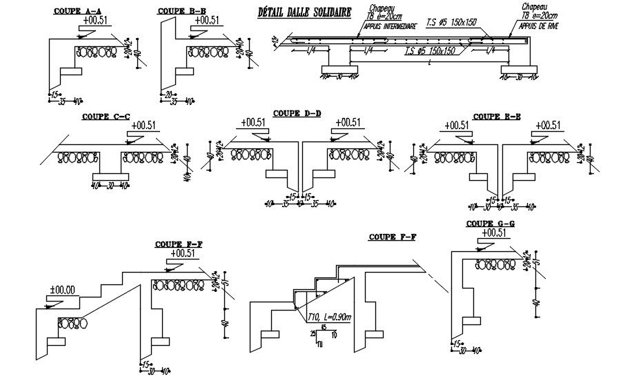 Design of Cross section of staircase with reinforcement and formwork details in AutoCAD 2D drawing, CAD file, dwg file