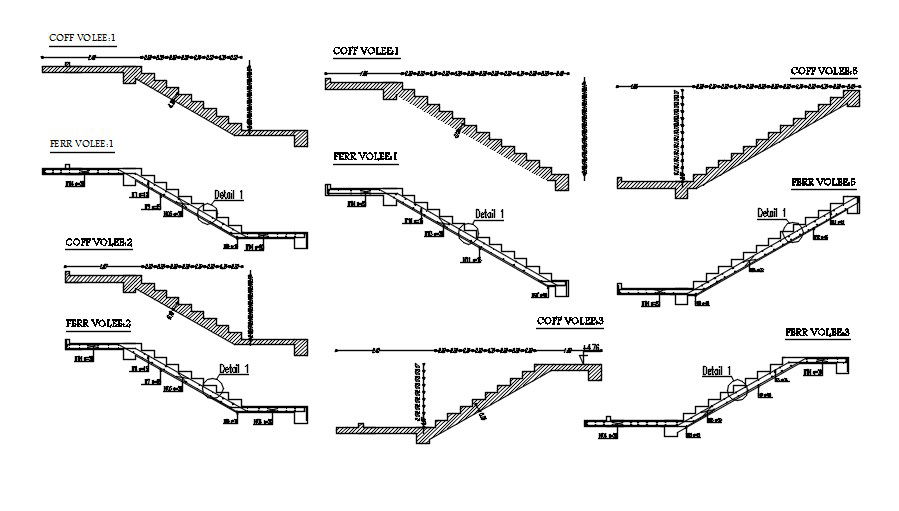 Staircase section with formwork and reinforcement details in AutoCAD 2D drawing, CAD file, dwg file