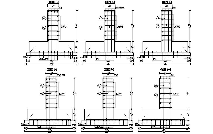 2D design of different sections of footing with reinforcement details in AutoCAD drawing, CAD file, dwg file